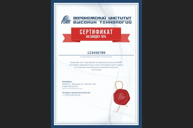 1 июня 2017 года Воронежский институт высоких технологий открывает набор на все формы и направления обучения. В рамках корпоративной программы лояльности предлагаем вам воспользоваться новым сервисом «Промо-код» в личном кабинете на сайте vivt.ru. Он дает возможность получить скидку 10 % при поступлении в ВИВТ на программы высшего и среднего профессионального образования.